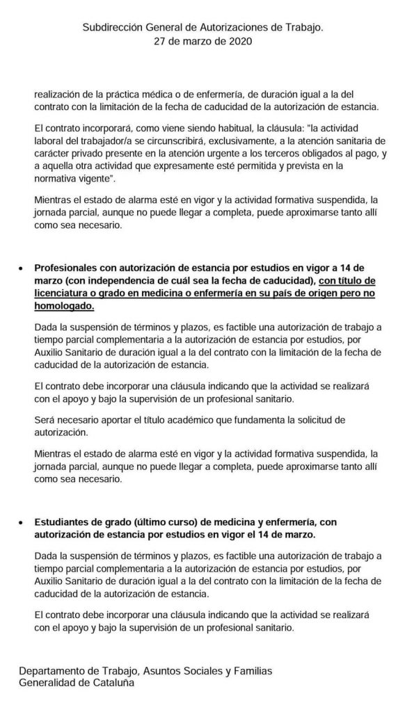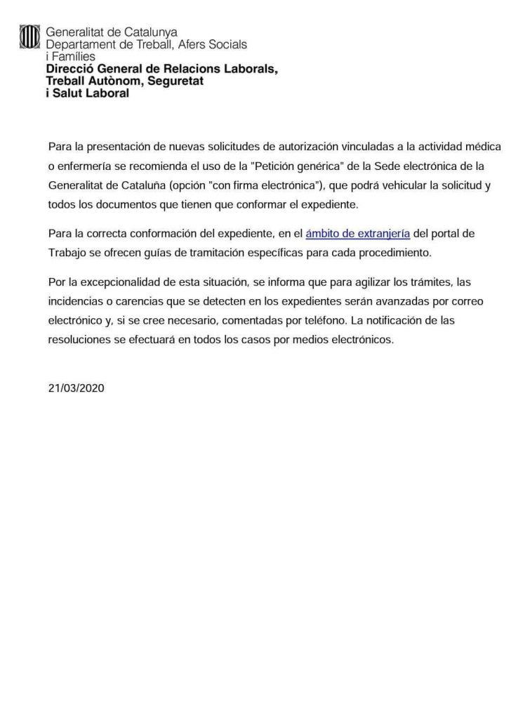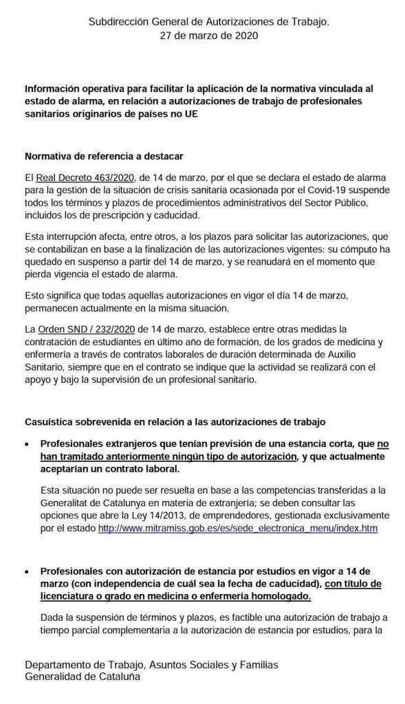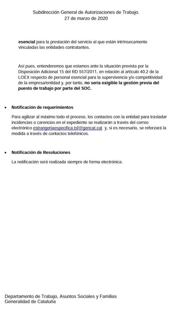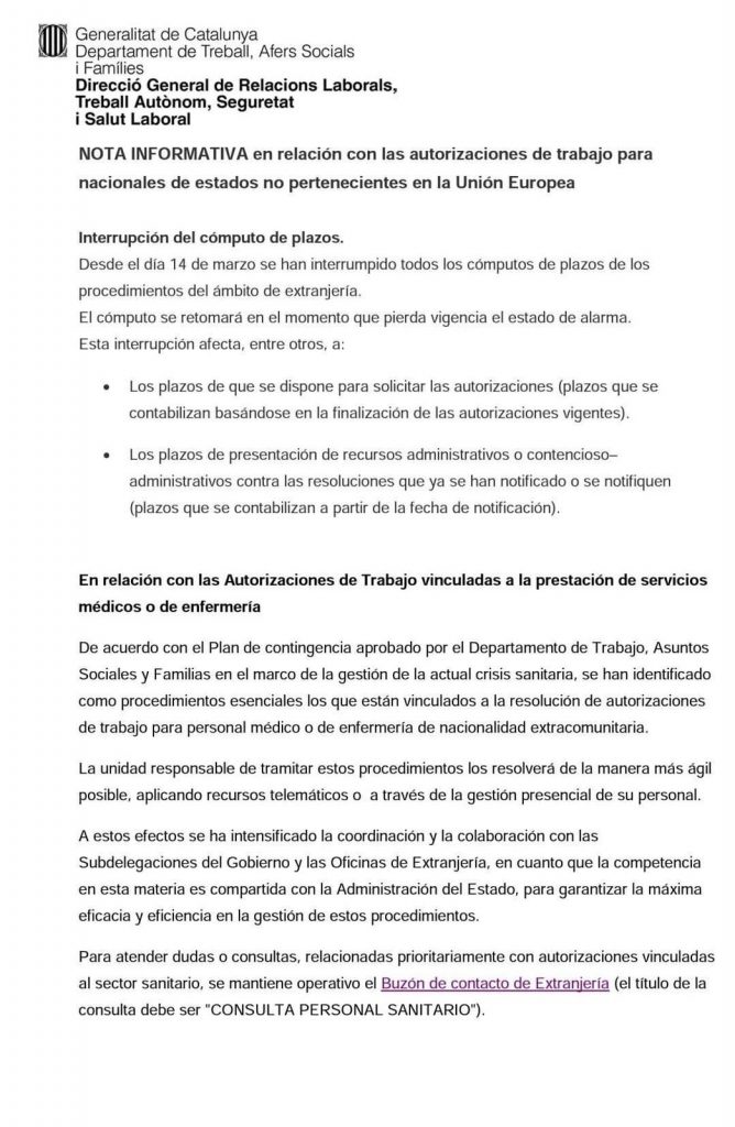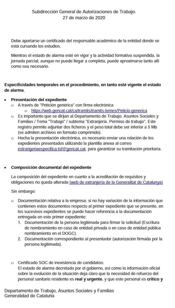 Instrucciones de Cataluña sobre Autorización de trabajo para nacionales de estados no pertenecientes a la UE.
