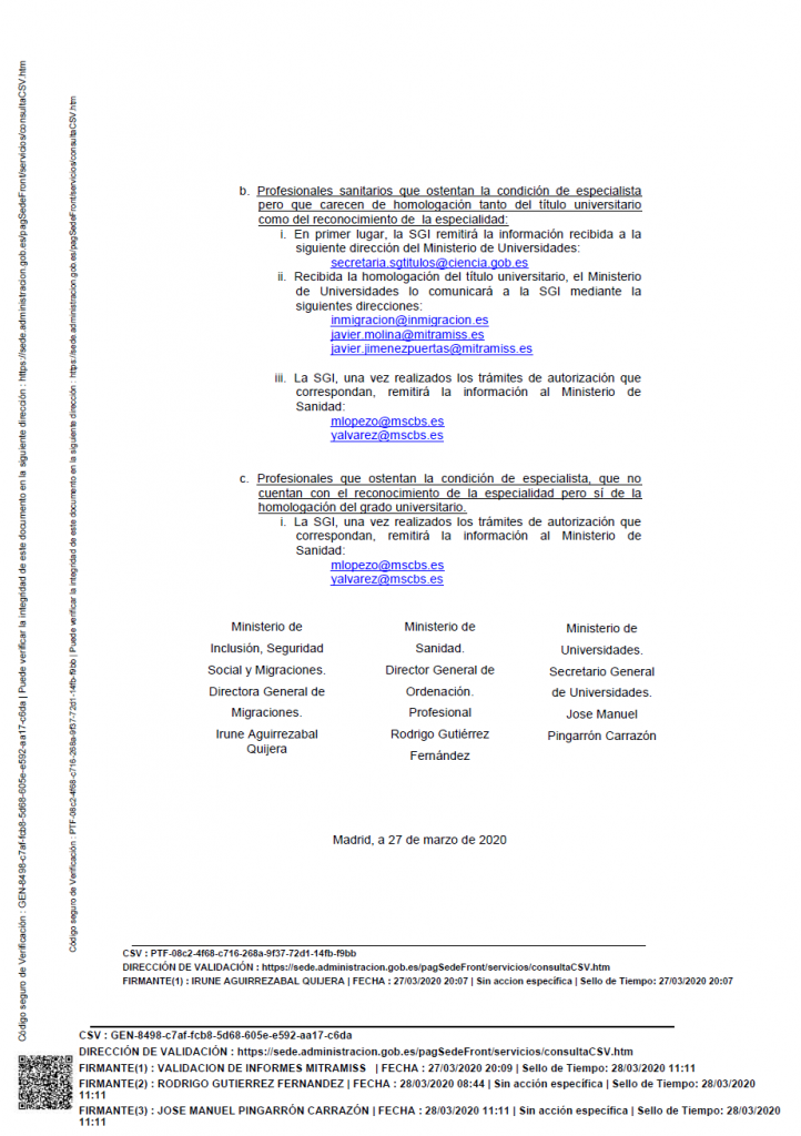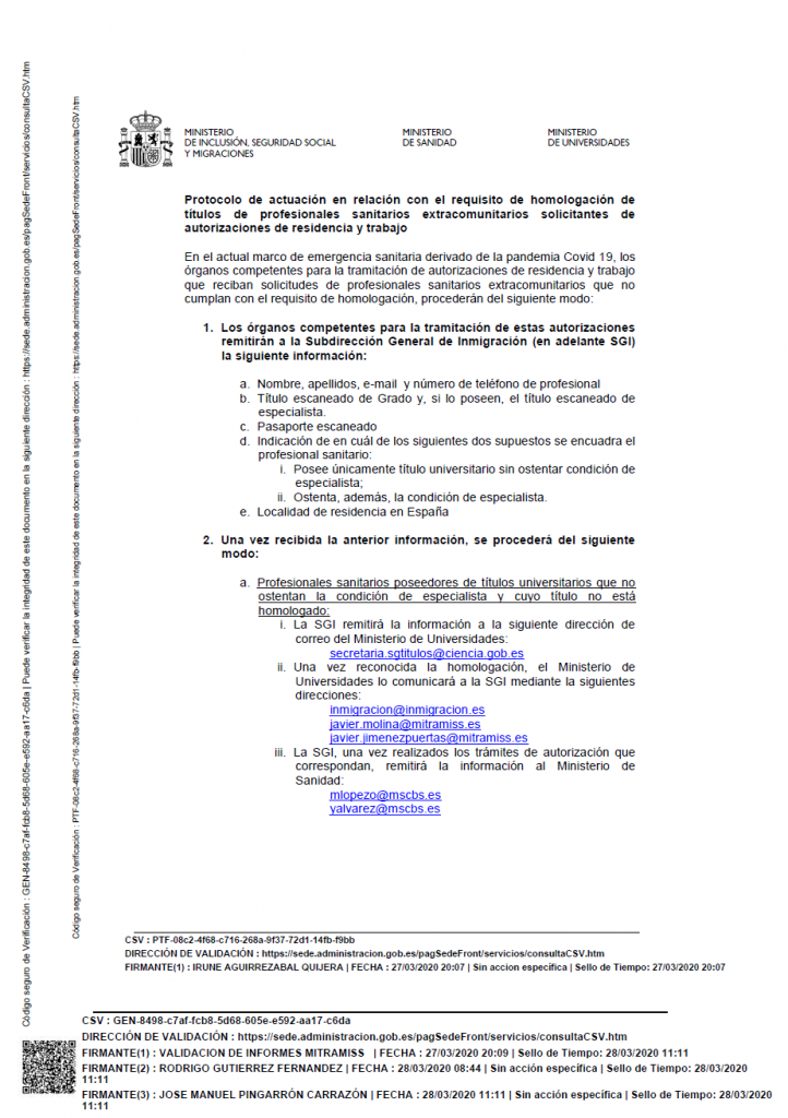 Protocolo de actuación en relación con el requisito de homologación de títulos de profesionales sanitarios extracomunitarios solicitantes de autorizaciones de residencia y trabajo